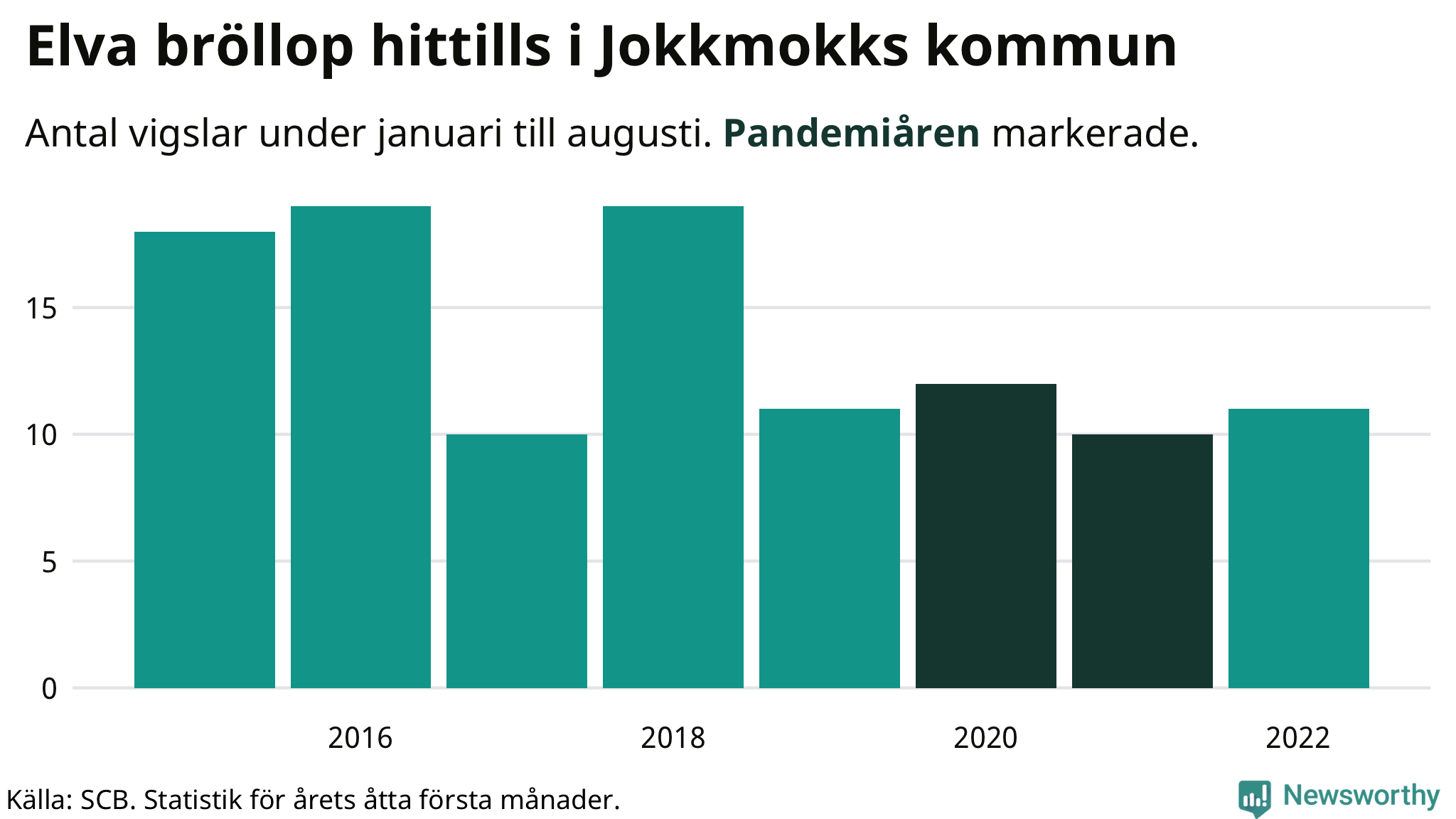 I Jokkmokk lämnade inte pandemin något jätteavtryck i bröllopsstatistiken, men i Norrbottens län som helhet har bröllopskurvan återhämtat sig – dock inte riktigt till samma nivå som innan pandemin. Hittills i år har 788 äktenskap ingåtts, jämfört med 636 i snitt under pandemin och runt 900 mellan 2015 och 2019. I fyra av 14 kommuner är antalet vigslar i nivå med eller högre än åren innan pandemin.