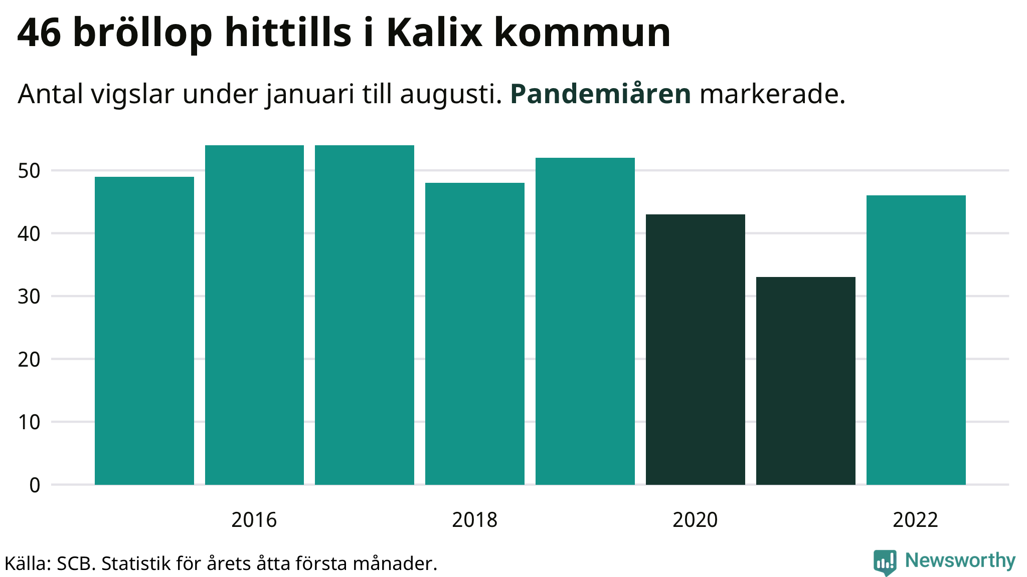 Till och med augusti i år har 46 giftermål registrerats i Kalix kommun. Det är åtta fler än snittet under pandemin. Under 2020 och 2021 – då restriktionerna gällde – sjönk antalet vigslar med en fjärdedel i Kalix jämfört med snittet åren innan.