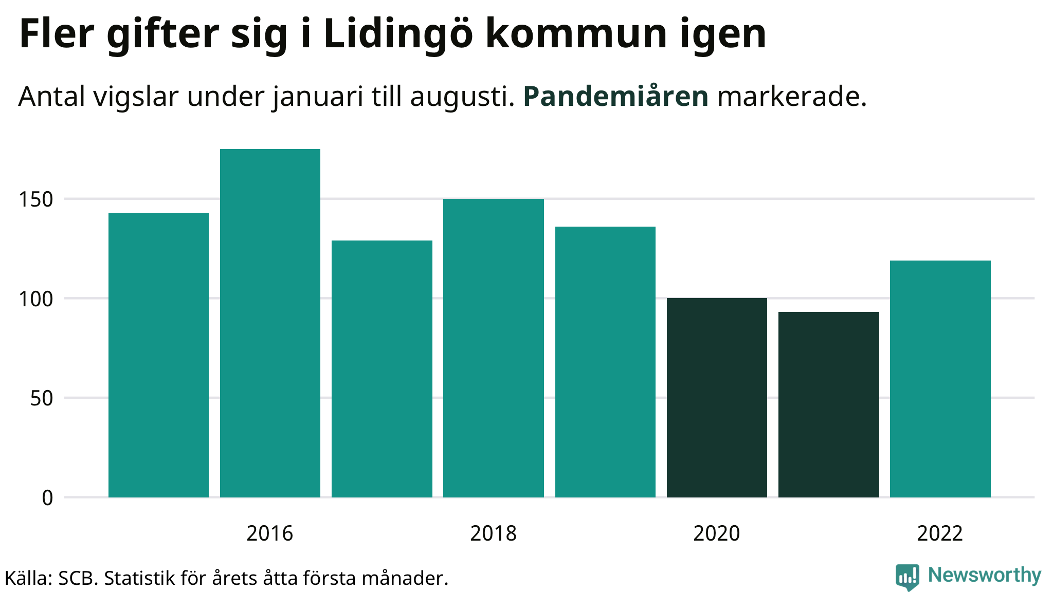 Till och med augusti i år har 119 giftermål registrerats i Lidingö kommun. Det är 23 fler än snittet under pandemin. Under 2020 och 2021 – då restriktionerna gällde – sjönk antalet vigslar med en tredjedel i Lidingö jämfört med snittet åren innan.