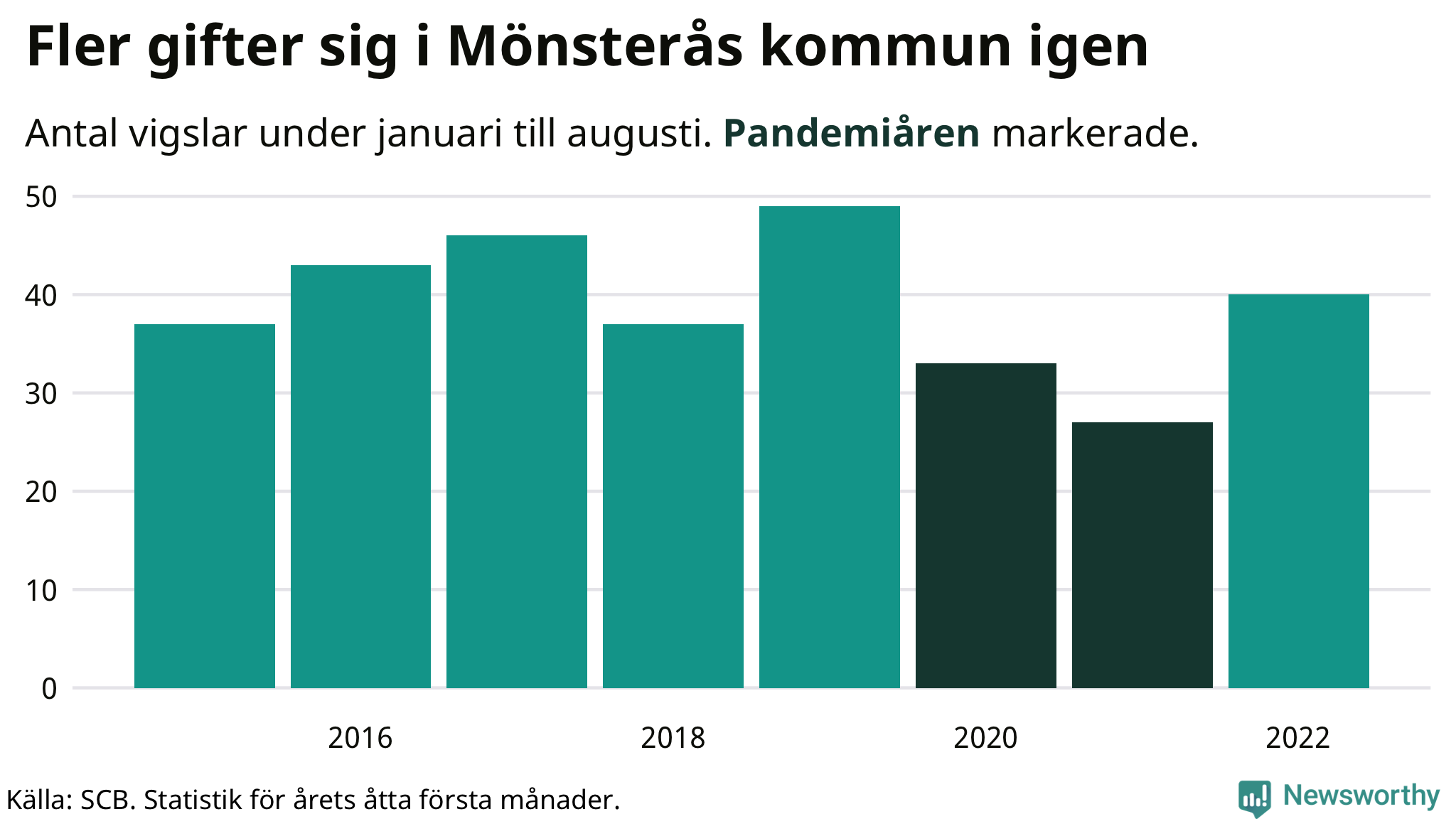 Till och med augusti i år har 40 giftermål registrerats i Mönsterås kommun. Det är tio fler än snittet under pandemin. Under 2020 och 2021 – då restriktionerna gällde – sjönk antalet vigslar med en tredjedel i Mönsterås jämfört med snittet åren innan.