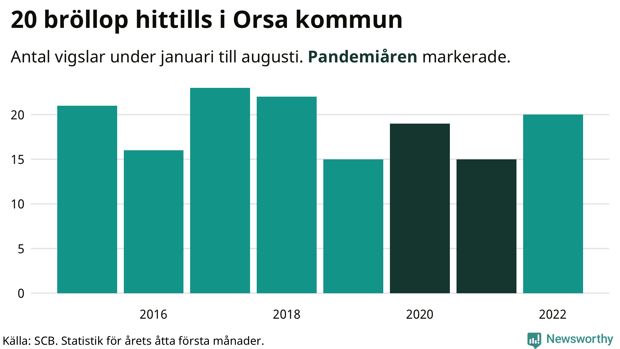 I Orsa lämnade inte pandemin något jätteavtryck i bröllopsstatistiken, men i Dalarnas län som helhet har bröllopskurvan återhämtat sig – dock inte riktigt till samma nivå som innan pandemin. Hittills i år har 842 äktenskap ingåtts, jämfört med 640 i snitt under pandemin och runt 1 000 mellan 2015 och 2019. I sex av 15 kommuner är antalet vigslar i nivå med eller högre än åren innan pandemin.