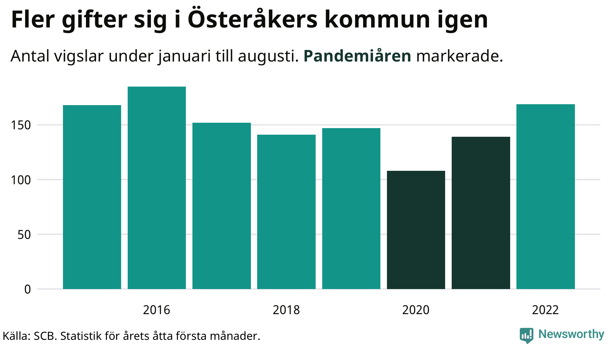 Till och med augusti i år har 169 giftermål registrerats i Österåkers kommun. Det är 45 fler än snittet under pandemin och den högsta siffran för årets första åtta månader sedan 2016. Under 2020 och 2021 – då restriktionerna gällde – sjönk antalet vigslar med en femtedel i Österåker jämfört med snittet åren innan.