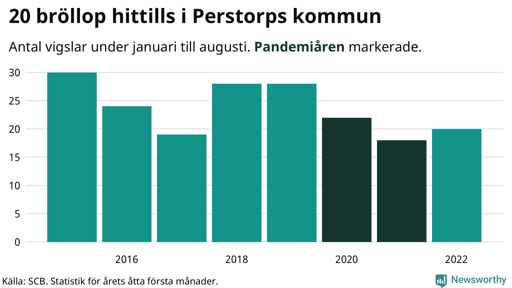 Till och med augusti i år har 20 giftermål registrerats i Perstorps kommun. Det är ungefär på samma nivå som under pandemirestriktionerna, motsvarande siffra för 2020 och 2021 var 22 respektive 18 vigslar.