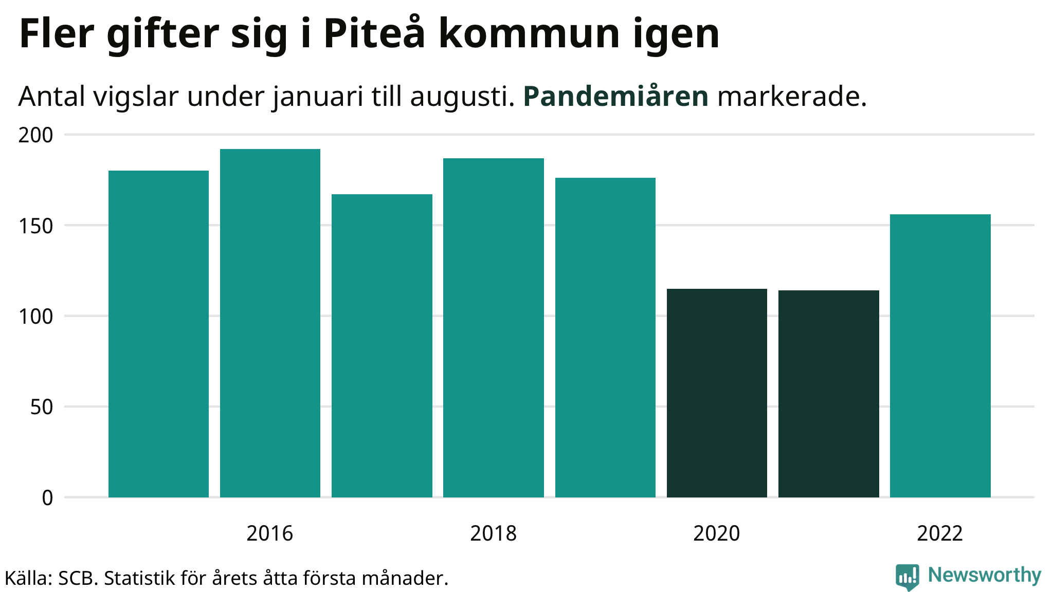 Till och med augusti i år har 156 giftermål registrerats i Piteå kommun. Det är 42 fler än snittet under pandemin. Under 2020 och 2021 – då restriktionerna gällde – sjönk antalet vigslar med två femtedelar i Piteå jämfört med snittet åren innan.