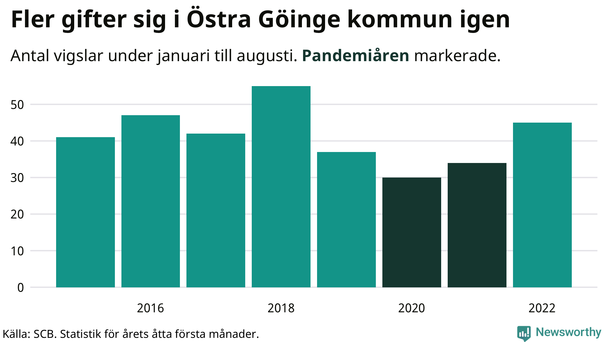 Till och med augusti i år har 45 giftermål registrerats i Östra Göinge kommun. Det är 13 fler än snittet under pandemin. Under 2020 och 2021 – då restriktionerna gällde – sjönk antalet vigslar med en fjärdedel i Östra Göinge jämfört med snittet åren innan.