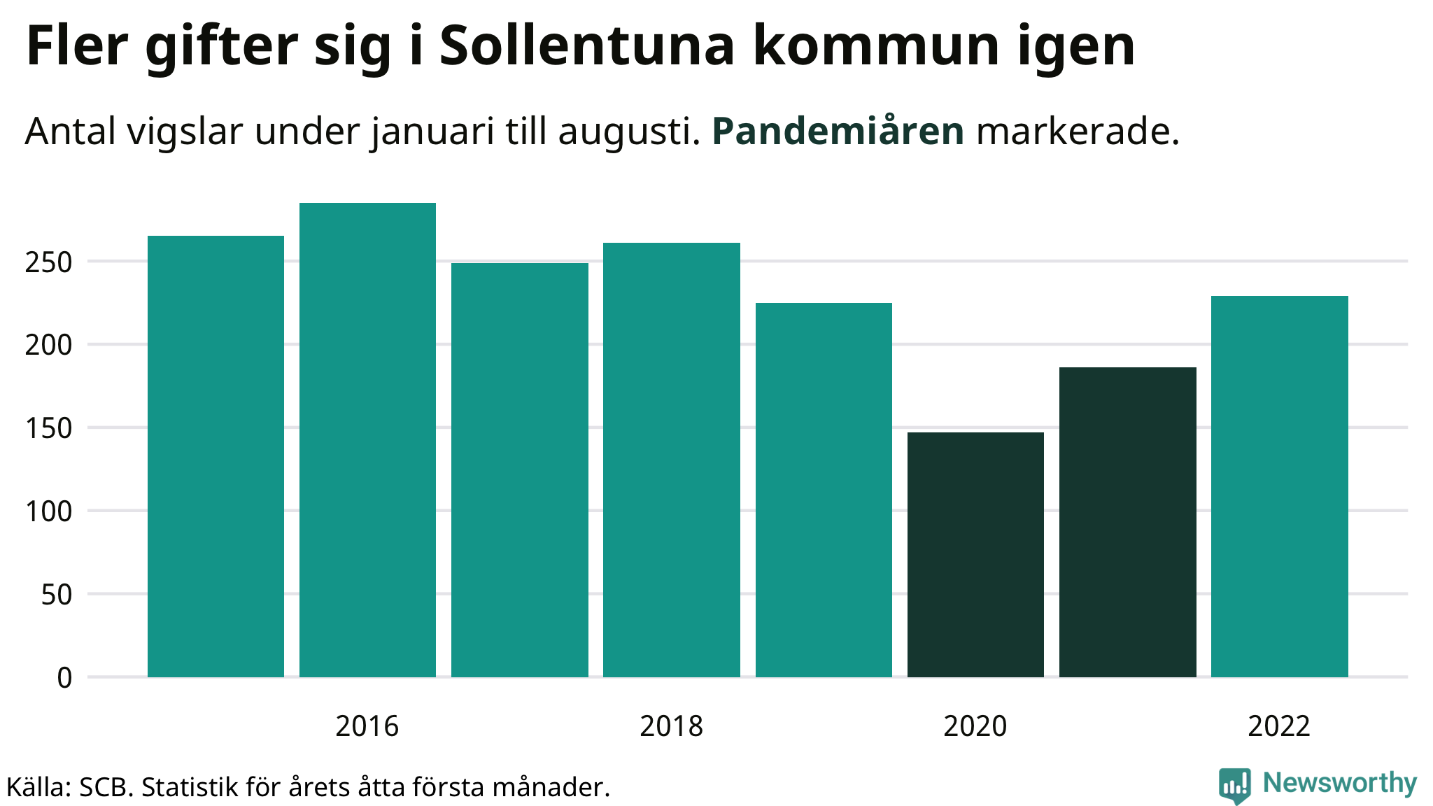 Till och med augusti i år har 229 giftermål registrerats i Sollentuna kommun. Det är 63 fler än snittet under pandemin. Under 2020 och 2021 – då restriktionerna gällde – sjönk antalet vigslar med en tredjedel i Sollentuna jämfört med snittet åren innan.