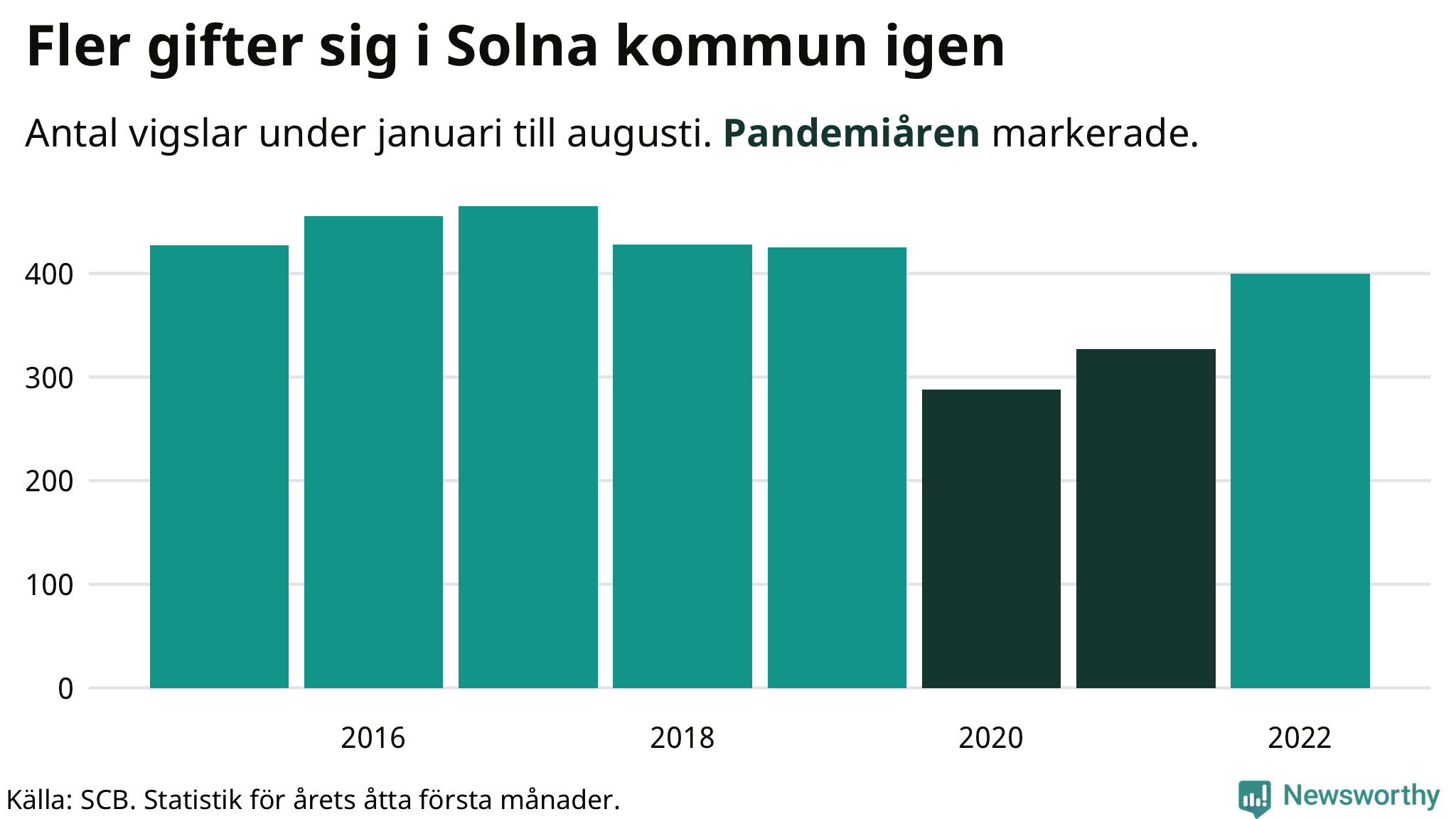 Till och med augusti i år har 400 giftermål registrerats i Solna kommun. Det är 92 fler än snittet under pandemin. Under 2020 och 2021 – då restriktionerna gällde – sjönk antalet vigslar med en tredjedel i Solna jämfört med snittet åren innan.