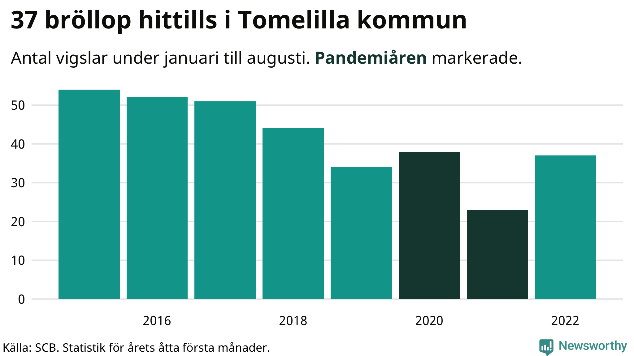 I Tomelilla lämnade inte pandemin något jätteavtryck i bröllopsstatistiken, men i Skåne län som helhet har bröllopskurvan återhämtat sig till förpandemi-nivåer. Hittills i år har 4 696 äktenskap ingåtts, jämfört med 3 658 i snitt under pandemin och runt 5 100 mellan 2015 och 2019. I 13 av 33 kommuner är antalet vigslar i nivå med eller högre än åren innan pandemin.