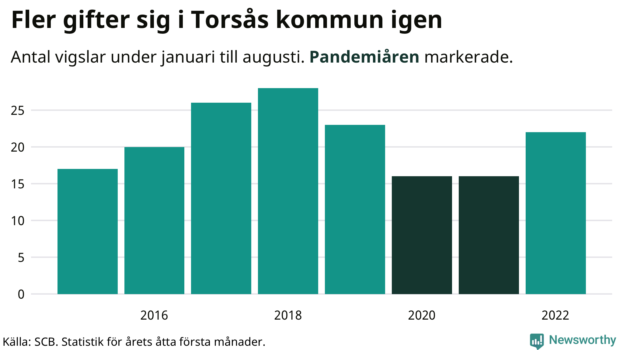 Till och med augusti i år har 22 giftermål registrerats i Torsås kommun. Det är sex fler än snittet under pandemin. Under 2020 och 2021 – då restriktionerna gällde – sjönk antalet vigslar med en tredjedel i Torsås jämfört med snittet åren innan.