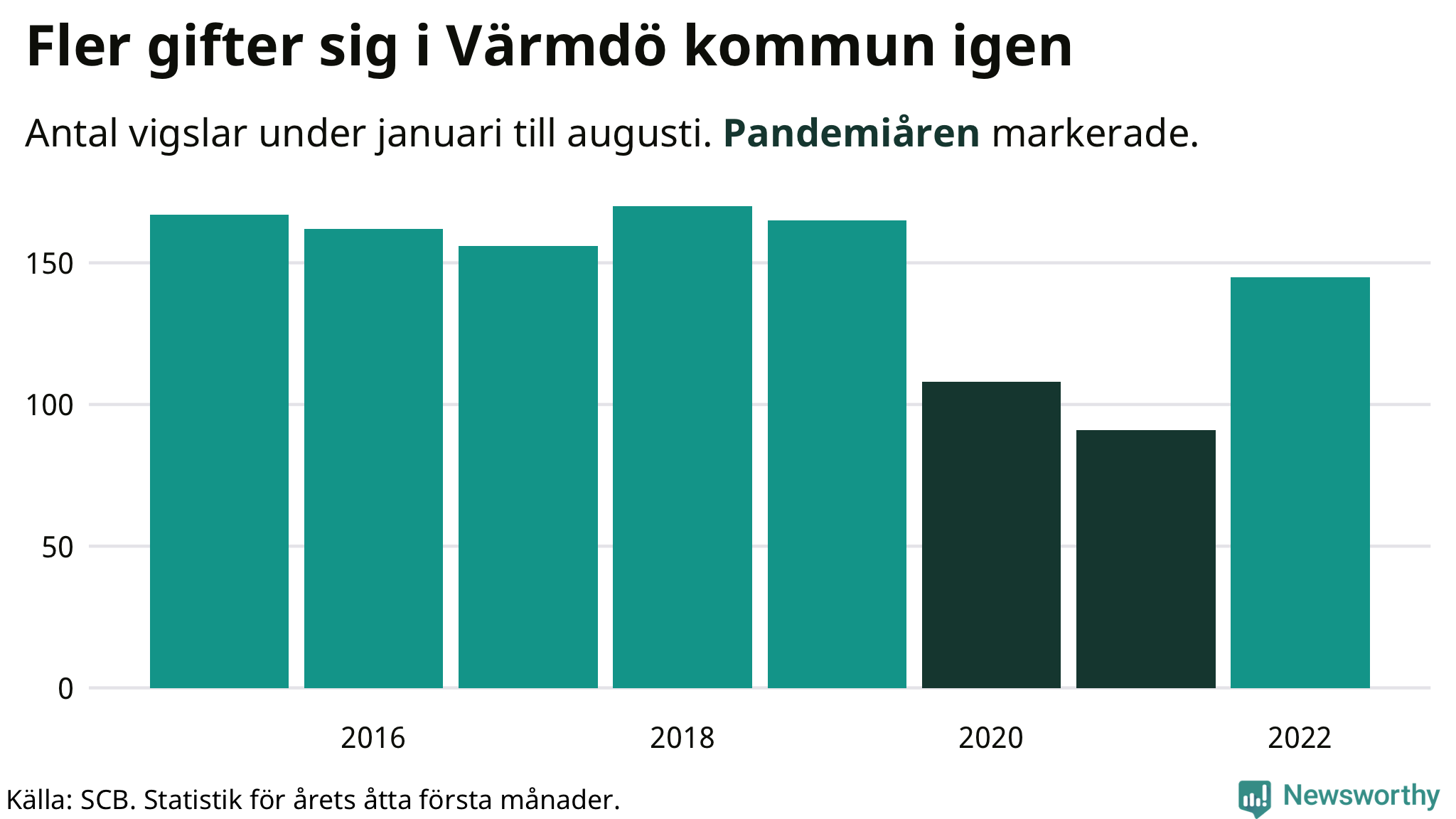 Till och med augusti i år har 145 giftermål registrerats i Värmdö kommun. Det är 45 fler än snittet under pandemin. Under 2020 och 2021 – då restriktionerna gällde – sjönk antalet vigslar med två femtedelar i Värmdö jämfört med snittet åren innan.