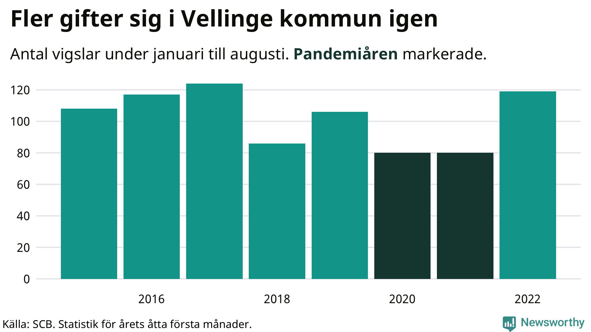 Till och med augusti i år har 119 giftermål registrerats i Vellinge kommun. Det är 39 fler än snittet under pandemin. Under 2020 och 2021 – då restriktionerna gällde – sjönk antalet vigslar med en fjärdedel i Vellinge jämfört med snittet åren innan.