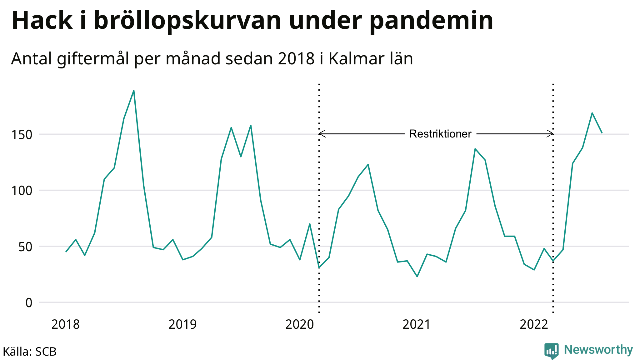 Även i Kalmar län som helhet har bröllopskurvan återhämtat sig till förpandemi-nivåer. Hittills i år har 743 äktenskap ingåtts, jämfört med 574 i snitt under pandemin och runt 800 mellan 2015 och 2019. I sju av tolv kommuner är antalet vigslar i nivå med eller högre än åren innan pandemin.