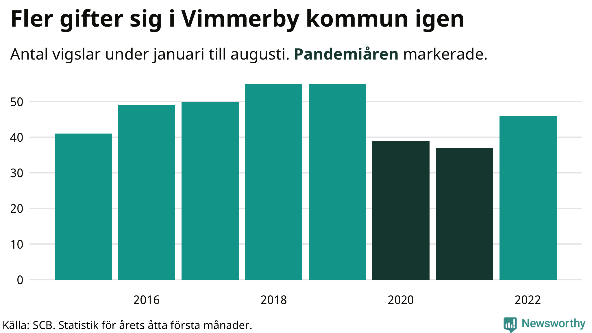 Till och med augusti i år har 46 giftermål registrerats i Vimmerby kommun. Det är åtta fler än snittet under pandemin. Under 2020 och 2021 – då restriktionerna gällde – sjönk antalet vigslar med en fjärdedel i Vimmerby jämfört med snittet åren innan.