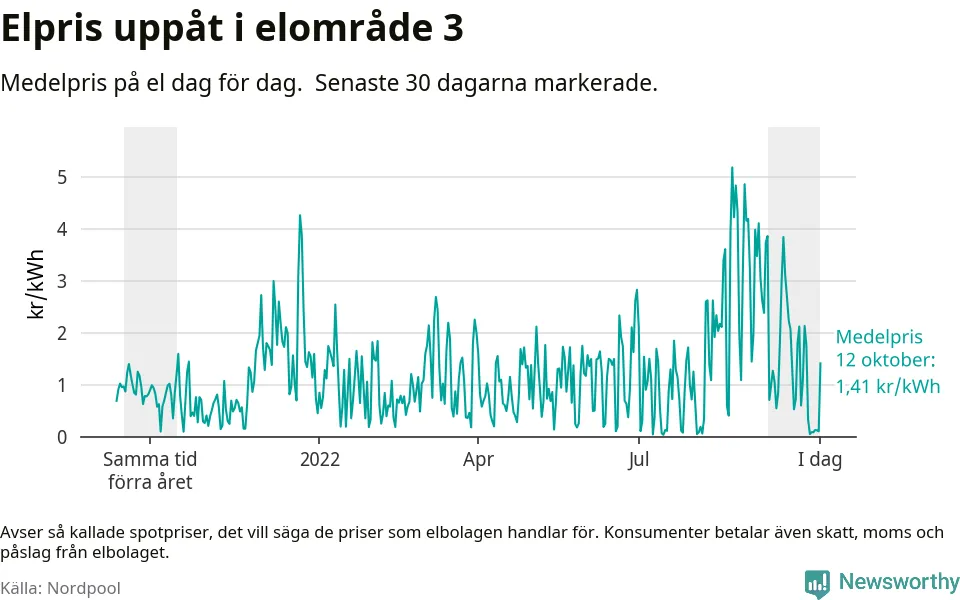 Dygnspriset på el är i dag, den 12 oktober, 1,41 kronor i elområde 3 på den nordiska elbörsen Nordpool. Jämfört med i dag stiger elpriset med hela 1,31 kronor mer kWh.