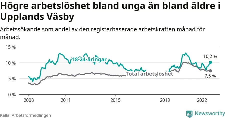 Precis som den totala arbetslösheten ligger ungdomsarbetslösheten i Upplands Väsby högre än i Stockholms län som helhet. Skillnaden mellan kommunen och länet är 2,9 procentenheter.