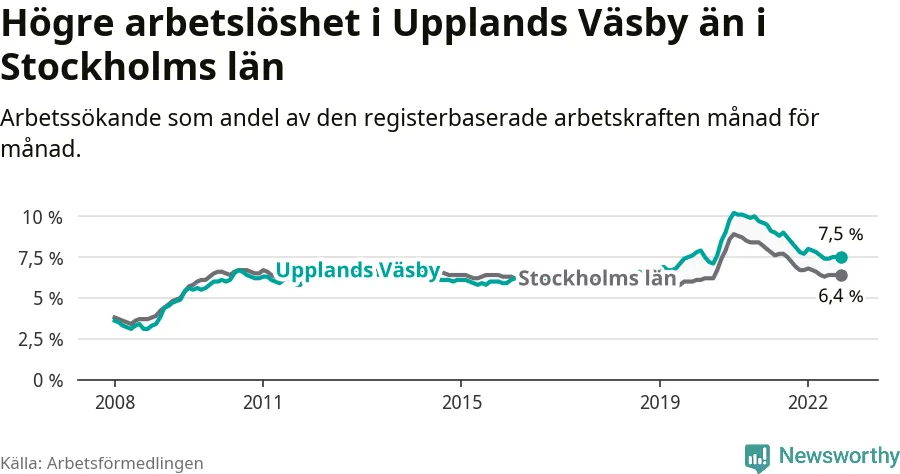 Även om arbetslösheten i Upplands Väsby alltså minskar, så ligger den fortfarande över snittet i hela Stockholms län (7,5 procent i kommunen, jämfört med 6,4 procent i hela länet). Ekerö har den lägsta arbetslösheten i länet (3,1 procent), medan Botkyrka har den högsta (11,3 procent). För att Upplands Väsby skulle komma ner i samma arbetslöshetsnivå som Ekerö skulle 1 059 personer behöva sysselsättas.