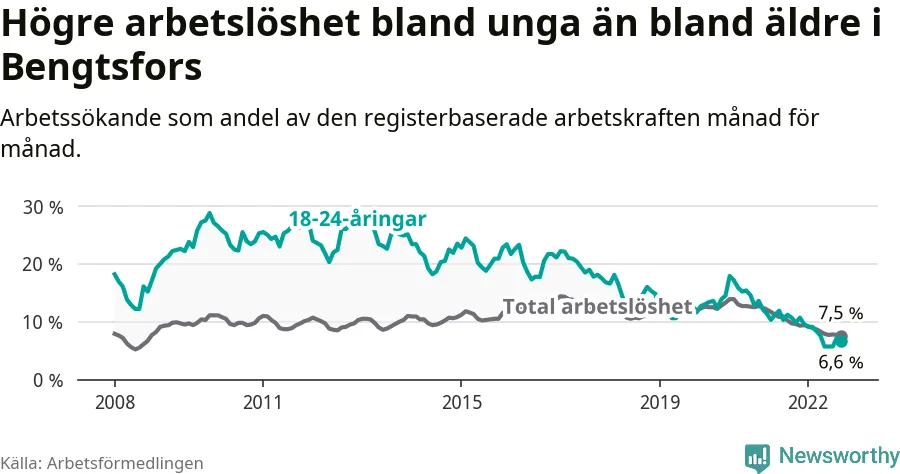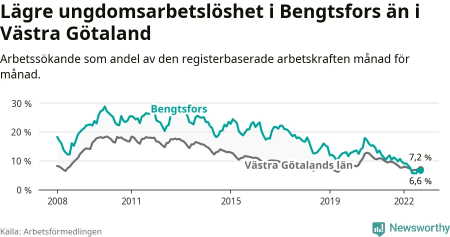 Medan Bengtsfors har högre total arbetslöshet än Västra Götaland, ligger ungdomsarbetslösheten 0,6 procentenheter lägre i Bengtsfors.