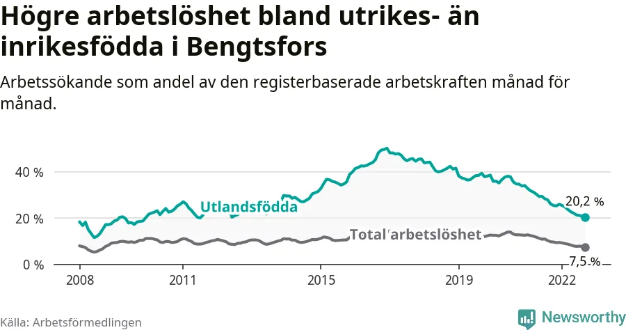 Arbetslösheten bland utlandsfödda var 20,2 procent i Bengtsfors under september månad, motsvarande 148 av 733 personer. Det är 5,8 procentenheter färre än vid samma tidpunkt i fjol (−65 om man räknar personer). Därmed har de utlandsföddas arbetslöshet varit lägre än vid samma tidpunkt i fjol i över två år i sträck. Sedan juni 2020 har arbetslösheten bland utlandsfödda minskat från 38,0 till 20,2 procent. Den nuvarande arbetslöshetsnivån är den lägsta sedan juli 2011.