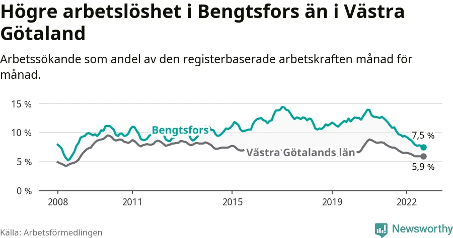 Under september månad rapporterade Bengtsfors kommun en total arbetslöshet på 7,5 procent. Det är en minskning jämfört med samma tidpunkt i fjol (−2,2 procentenheter). Även i Västra Götalands län sjunker arbetslösheten .