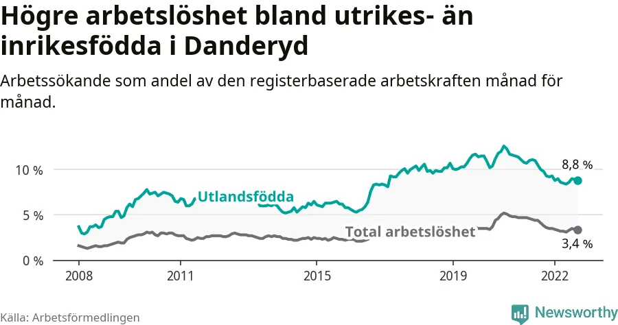 Skillnaden i arbetslöshet mellan utrikesfödda och hela befolkningen är 5,4 procentenheter i Danderyd. Det är en mindre skillnad än för ett år sedan (−0,6 procentenheter).