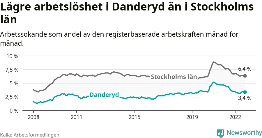 Danderyd hade redan tidigare lägre arbetslöshet än snittet i hela Stockholms län och nu växer klyftan (3,4 procent i kommunen, jämfört med 6,4 procent i hela länet). Ekerö har den lägsta arbetslösheten i länet (3,1 procent), medan Botkyrka har den högsta (11,3 procent). För att Danderyd skulle komma ner i samma arbetslöshetsnivå som Ekerö skulle 43 personer behöva sysselsättas.
