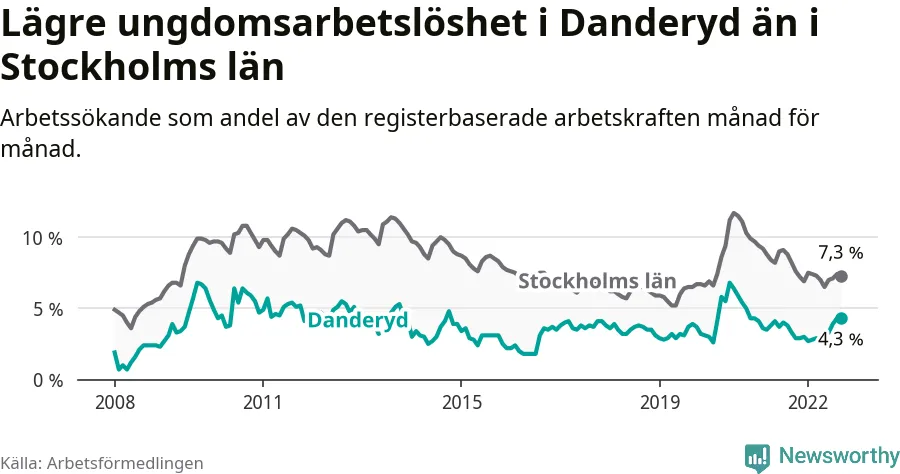 Precis som den totala arbetslösheten ligger ungdomsarbetslösheten i Danderyd lägre än i Stockholms län som helhet. Skillnaden mellan kommunen och länet är 3,0 procentenheter. Medan ungdomsarbetslösheten i Danderyd alltså ökar så minskar den i Stockholms län (−0,9 procentenheter).