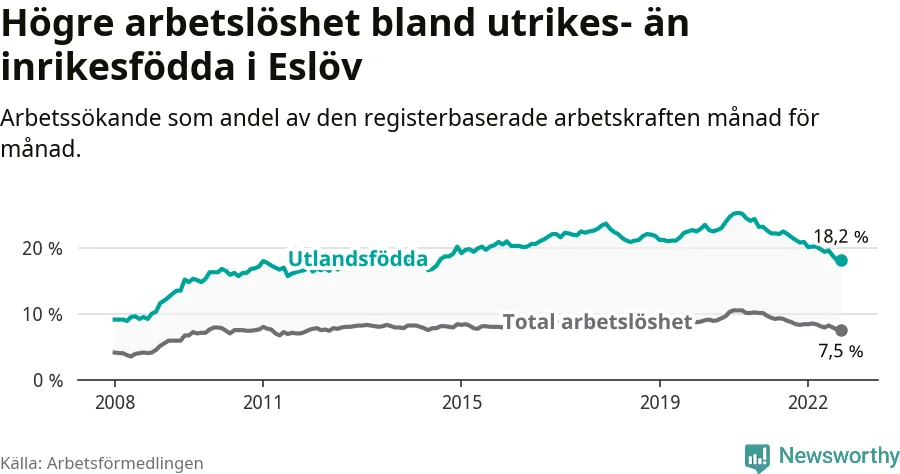 Skillnaden i arbetslöshet mellan utrikesfödda och hela befolkningen är 10,7 procentenheter i Eslöv. Det är en betydligt mindre skillnad än för ett år sedan (−2,2 procentenheter).
