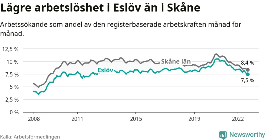 Det är 17:e månaden i följd som arbetslösheten i Eslöv är lägre än den var under samma tidpunkt året innan. Sedan april 2021 har arbetslösheten gått ner från 9,4 till 7,5 procent. Den nuvarande arbetslöshetsnivån är därmed den lägsta sedan maj 2014.