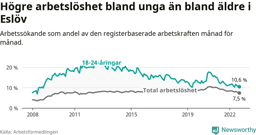 Medan Eslöv har lägre total arbetslöshet än Skåne, ligger ungdomsarbetslösheten 0,4 procentenheter högre i Eslöv.