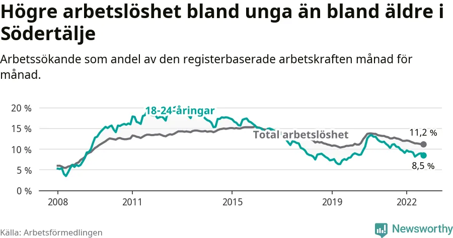 Graf: Arbetslöshet bland unga i Södertälje kommun och Stockholms län