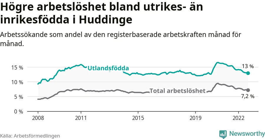 Skillnaden i arbetslöshet mellan utrikesfödda och hela befolkningen är 5,8 procentenheter i Huddinge. Det är en mindre skillnad än för ett år sedan (−0,9 procentenheter).