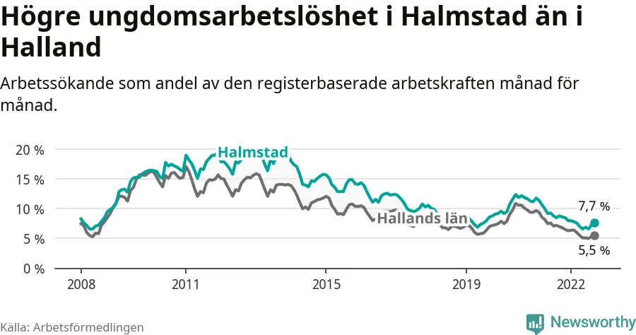Precis som den totala arbetslösheten ligger ungdomsarbetslösheten i Halmstad högre än i Halland som helhet. Skillnaden mellan kommunen och länet är 2,2 procentenheter.