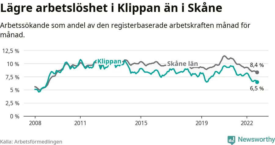 Det är 17:e månaden i följd som arbetslösheten i Klippan är lägre än den var under samma tidpunkt året innan. Sedan april 2021 har arbetslösheten gått ner från 8,5 till 6,5 procent. Den nuvarande arbetslöshetsnivån är därmed den lägsta sedan maj 2019.