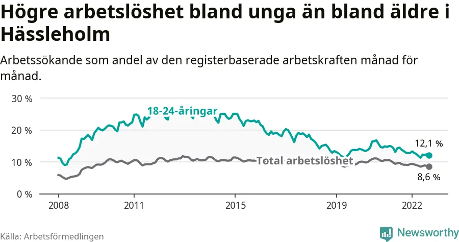 Medan Hässleholm har ungefär samma total arbetslöshet som Skåne, ligger ungdomsarbetslösheten 1,9 procentenheter högre i Hässleholm.
