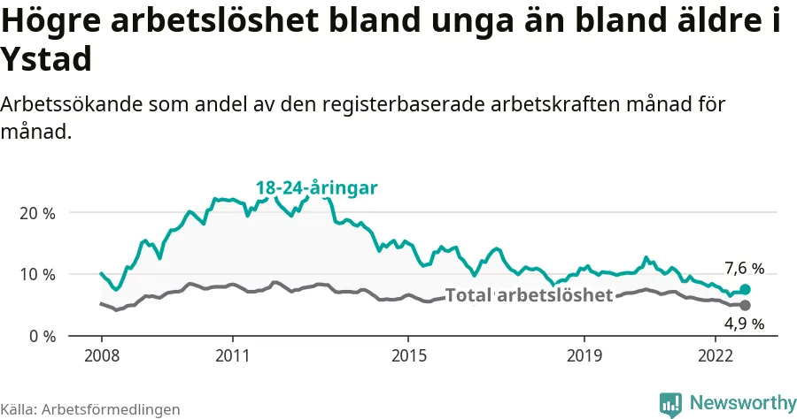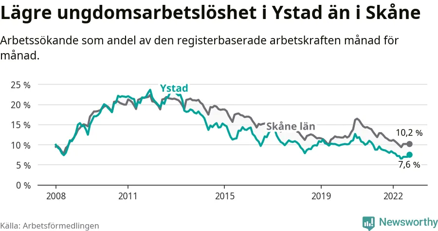 Precis som den totala arbetslösheten ligger ungdomsarbetslösheten i Ystad lägre än i Skåne som helhet. Skillnaden mellan kommunen och länet är 2,6 procentenheter.
