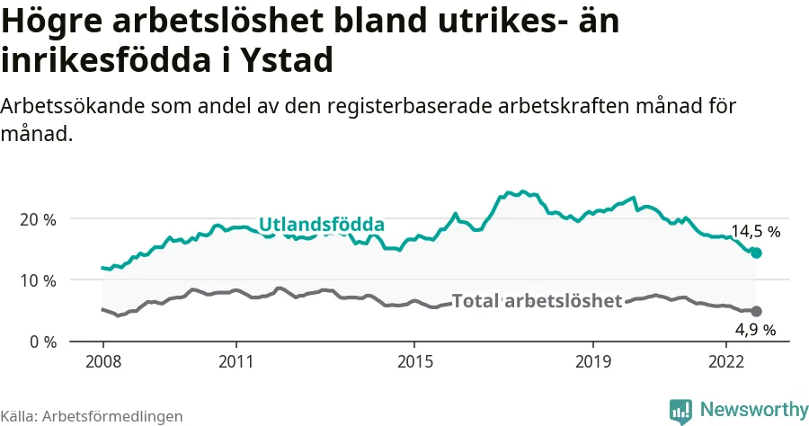Skillnaden i arbetslöshet mellan utrikesfödda och hela befolkningen är 9,6 procentenheter i Ystad. Det är en betydligt mindre skillnad än för ett år sedan (−1,6 procentenheter).
