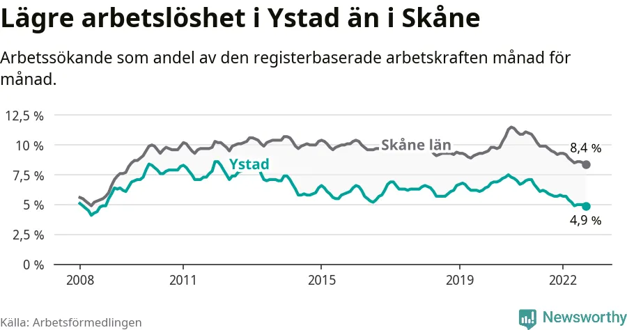 Det är 19:e månaden i följd som arbetslösheten i Ystad är lägre än den var under samma tidpunkt året innan. Sedan februari 2021 har arbetslösheten gått ner från 7,1 till 4,9 procent.