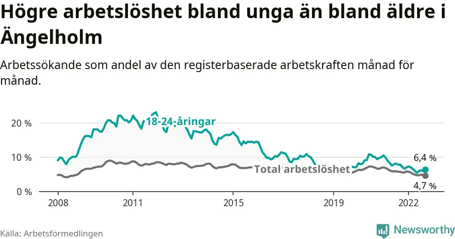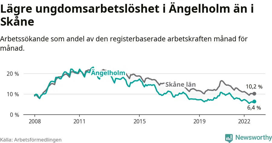 Precis som den totala arbetslösheten ligger ungdomsarbetslösheten i Ängelholm lägre än i Skåne som helhet. Skillnaden mellan kommunen och länet är 3,8 procentenheter.
