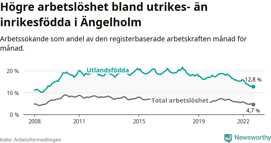Arbetslösheten bland utlandsfödda var 12,8 procent i Ängelholm under september månad, motsvarande 390 av 3 047 personer. Det är 2,5 procentenheter färre än vid samma tidpunkt i fjol (−79 om man räknar personer). Därmed är de utlandsföddas arbetslöshet lägre än vid samma tidpunkt i fjol för 19:e månaden i följd. Sedan februari 2021 har arbetslösheten bland utlandsfödda minskat från 17,8 till 12,8 procent. Den nuvarande arbetslöshetsnivån är den lägsta sedan januari 2009.