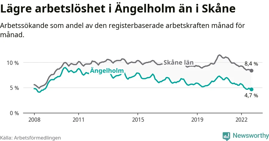 Det är 18:e månaden i följd som arbetslösheten i Ängelholm är lägre än den var under samma tidpunkt året innan. Sedan mars 2021 har arbetslösheten gått ner från 6,5 till 4,7 procent.