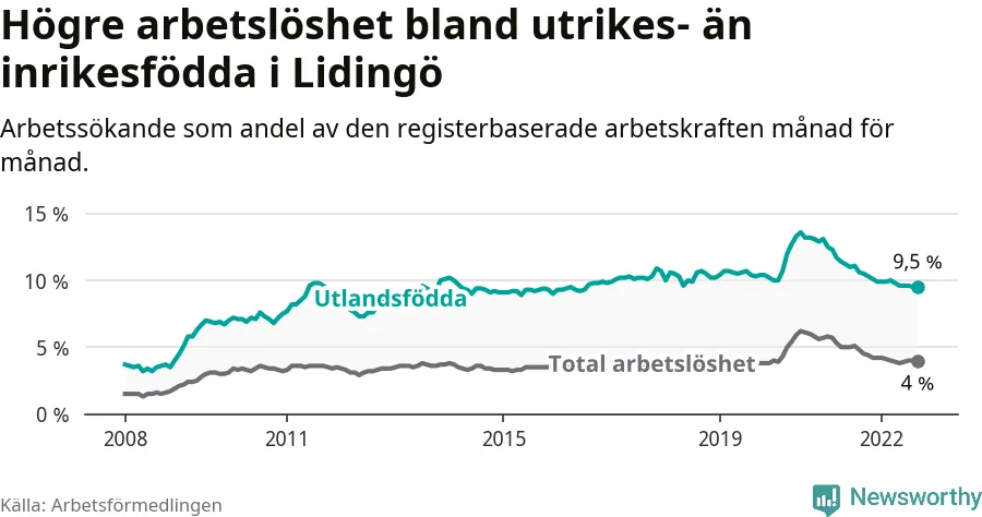 Arbetslösheten bland utlandsfödda var 9,5 procent i Lidingö under september månad, motsvarande 450 av 4 737 personer. Det är 1,0 procentenheter färre än vid samma tidpunkt i fjol (−54 om man räknar personer). Därmed är de utlandsföddas arbetslöshet lägre än vid samma tidpunkt i fjol för 18:e månaden i följd. Sedan mars 2021 har arbetslösheten bland utlandsfödda minskat från 11,7 till 9,5 procent.