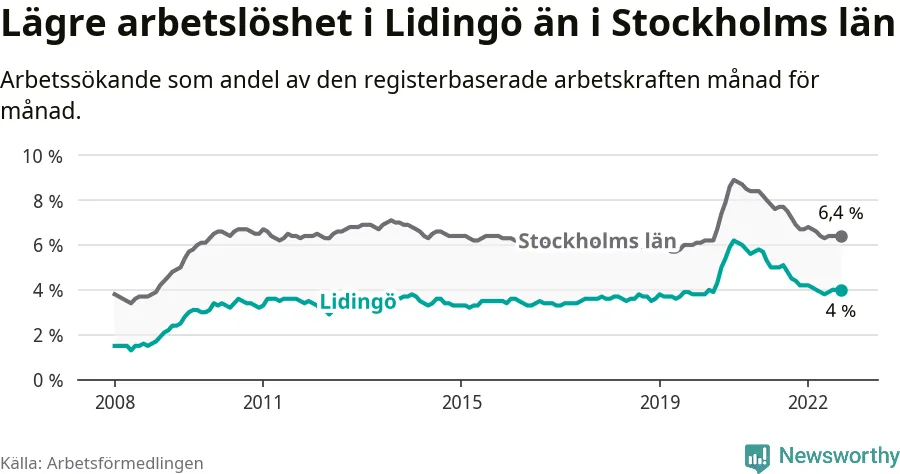 Det är 17:e månaden i följd som arbetslösheten i Lidingö är lägre än den var under samma tidpunkt året innan. Sedan april 2021 har arbetslösheten gått ner från 5,0 till 4,0 procent.