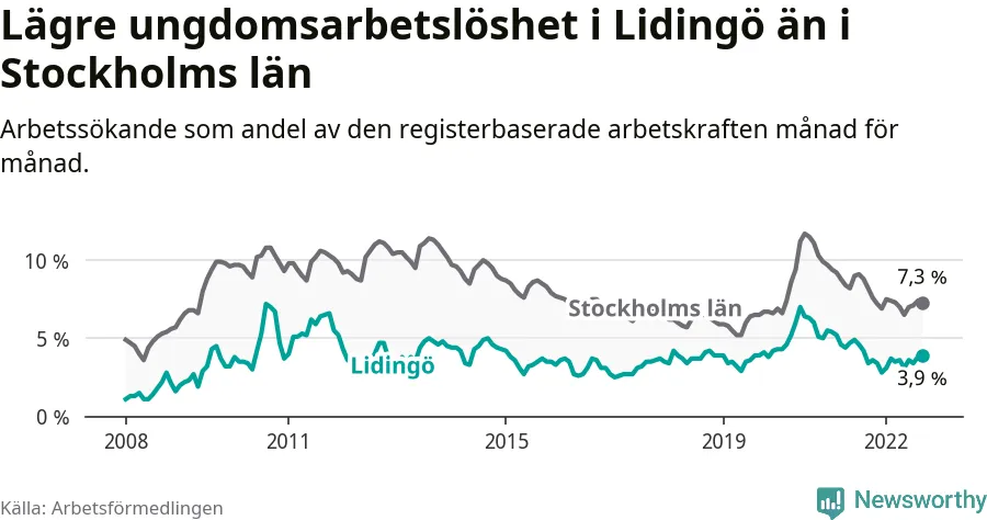 Precis som den totala arbetslösheten ligger ungdomsarbetslösheten i Lidingö lägre än i Stockholms län som helhet. Skillnaden mellan kommunen och länet är 3,4 procentenheter.