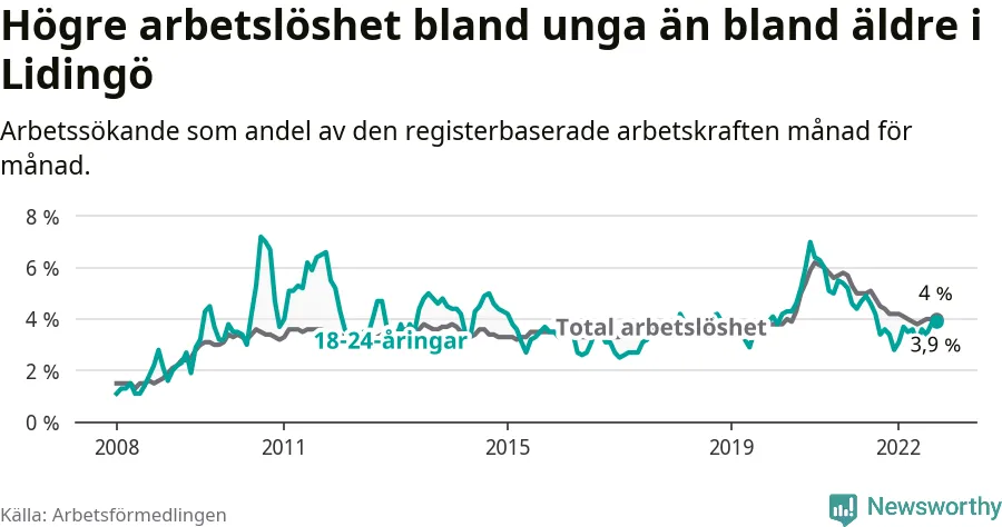 Den senaste månadsstatistiken från Arbetsförmedlingen visar på en uppgång i ungdomsarbetslöshet i Lidingö kommun med 0,5 procentenheter. Arbetslösheten bland personer i åldern 18–24 år låg i september på 3,9 procent.