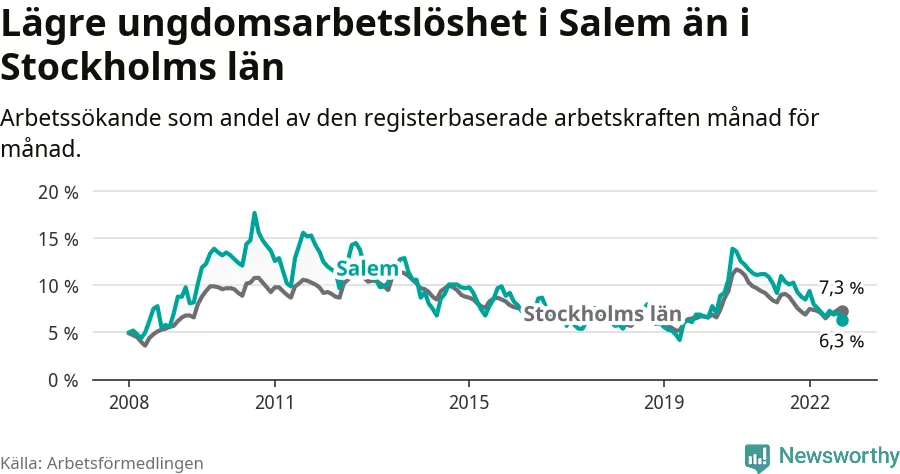 Precis som den totala arbetslösheten ligger ungdomsarbetslösheten i Salem lägre än i Stockholms län som helhet. Skillnaden mellan kommunen och länet är 1,0 procentenheter.