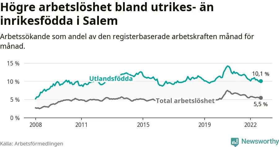 Skillnaden i arbetslöshet mellan utrikesfödda och hela befolkningen är 4,6 procentenheter i Salem. Det är en mindre skillnad än för ett år sedan (−0,8 procentenheter).