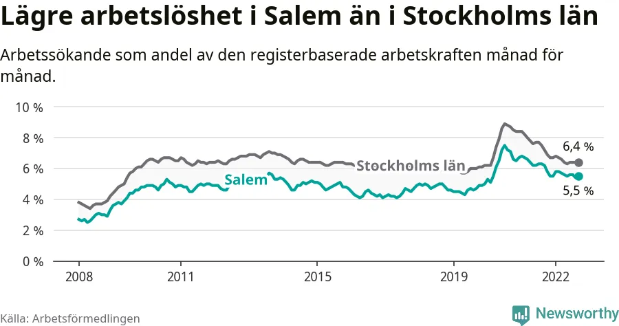 Graf: Arbetslöshet i Salems kommun och Stockholms län