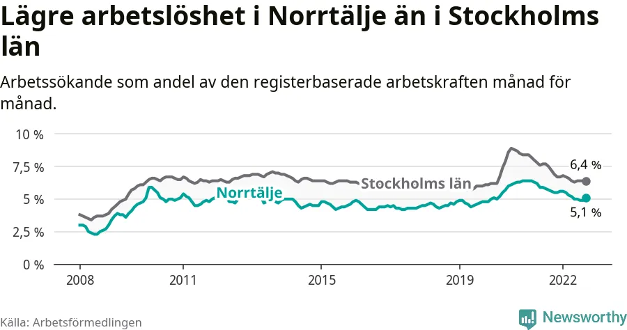 Graf: Arbetslöshet i Norrtälje kommun och Stockholms län