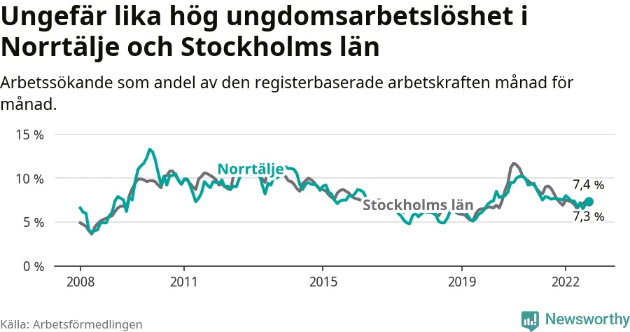 Medan Norrtälje har lägre total arbetslöshet än Stockholms län, ligger ungdomsarbetslösheten på i stort sett samma nivå.