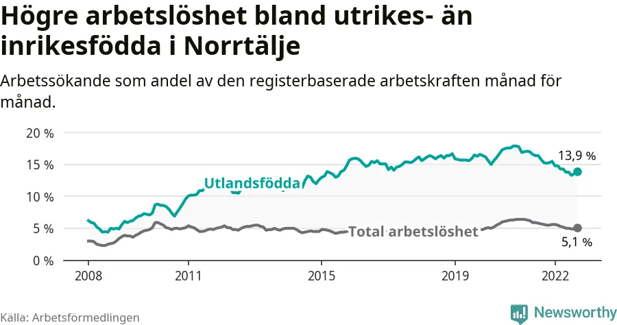 Skillnaden i arbetslöshet mellan utrikesfödda och hela befolkningen är 8,8 procentenheter i Norrtälje. Det är en mindre skillnad än för ett år sedan (−0,9 procentenheter).